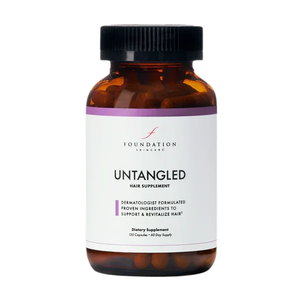 Foundation Skincare Untangled Hair Supplement Dermatologist-formulated supplement with marine collagen, biotin, and essential vitamins to strengthen hair follicles and increase keratin production. Contains proven ingredients including marine collagen, vitamins A, C, D, E, biotin, folic acid, and iron to revitalize stagnant hair growth cycles.
