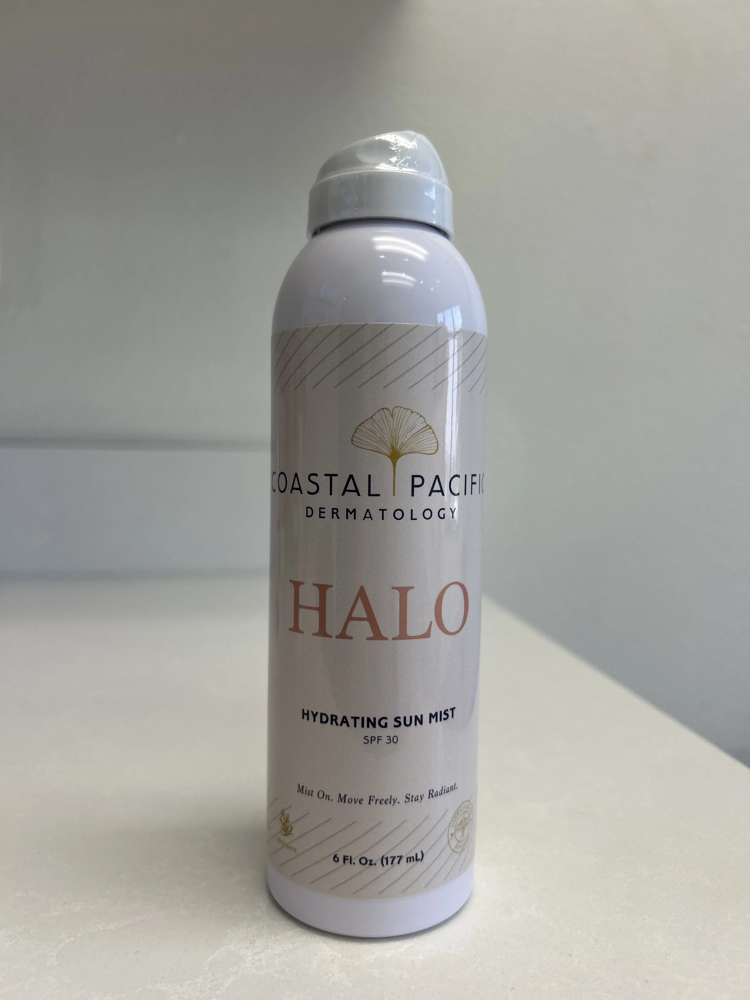 HALO Hydrating Sun Mist SPF 30 Lightweight spray sunscreen that hydrates while protecting. Easy to reapply throughout the day without messing up makeup. Perfect for active lifestyles and on-the-go touch-ups.